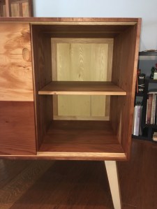 sliding door cabinet – right open clear redwood case on solid ash base featuring bypass sliding doors